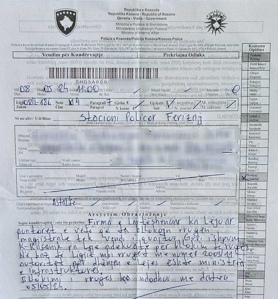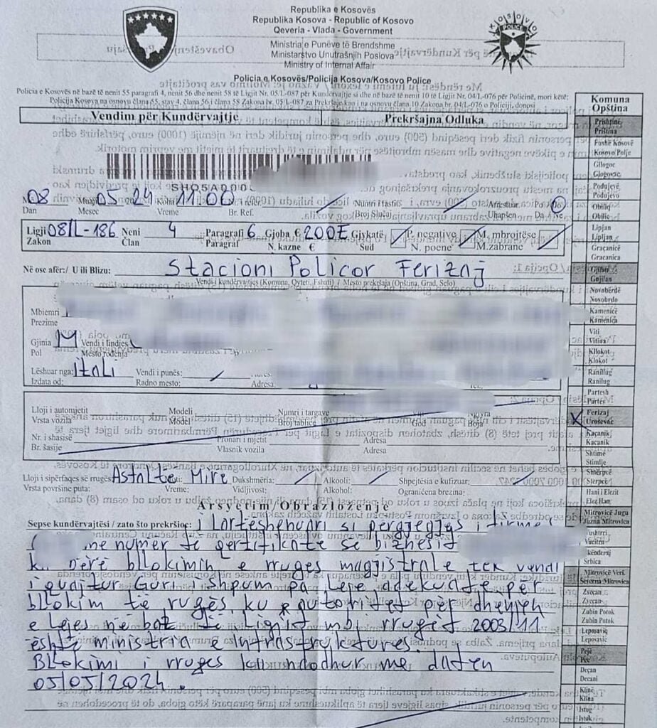 Përgjegjësi i një kompanie për rehabilitimin e linjës hekurudhore G.M, shtetas italian, i moshës 64 vjeçar është ftuar në Njësinë e Komunikacionit Rrugor në Ferizaj, me arsyetimin se pa leje përkatëse kishte bërë bllokimin e rrugës magjistrale Kaçanik- Hani Elezit , saktësisht tek vendi i quajtur ‘’Guri i Shpuar’’ në Kaçanik. Raporton/Rrjeti.Info.