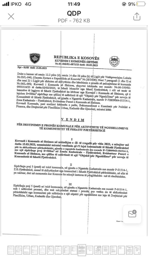 Një pjesë e banorëve të fshatit Pjetërshticë të Komunës së Shtimes në vitin e kaluar e kanë perfituar nje parcele per ta nisur ndërtimin e një objekti për të pame dhe ceremoni fetare me vetëfinancim. Komuna paraprakisht ua kishte ndarë parcelën prej 500 metra katrorë me vendim të Kuvendit. Vendimi menjëherë ishte kthyer i kundërligjshëm nga Ministria e Administrimit të Pushtetit Lokal dhe Ministria e Mjedisit dhe Planifikimit Hapësinor me qëllim që komuna duhet t’i ndjek disa hapa ligjor pasi që ka vepruar në kundërshtim me ligjin nr.04/L-174 për Planifikim Hapësinor. Në mbledhjen e fundit të Kuvendit Komunal që është mbajtur më 29 prill të këtij viti kuvendarët kishin kritikuar ekzekutivin se ua kanë vonuar këto dokumente dhe vendime për shfuqizim. Me shumicë të votave vendimi është shfuqizuar më 29 prill. Raporton/Rrjeti.Info.