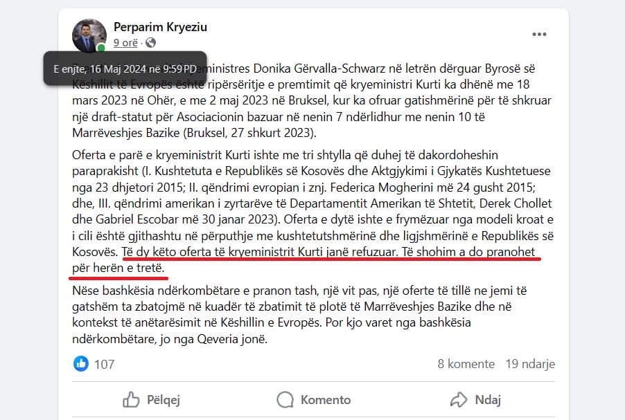“Të shohim a do të pranohet për herë të tretë”, ka shkruar zëdhënësi i Qeverisë Kurti, Përparim Kryeziu, deri sa është munduar të shpjegojë se letra e ministres së jashtme, Gërvalla – Shwarz është vazhdimësi e premtimeve të kryeministrit Kurti për Asociacionin e Komunave me Shumicë Serbe.