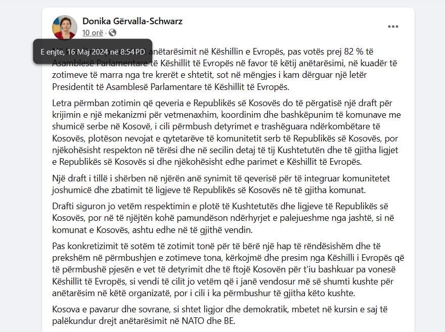 Si rrallëherë, ministrja e jashtme Donika Gërvalla – Shwarz njoftoi përmes Facebookut të saj se në mëngjesin e sotëm “i ka dërguar një letër Presidentit të Asamblesë Paramentare të Këshillit të Evropës”.