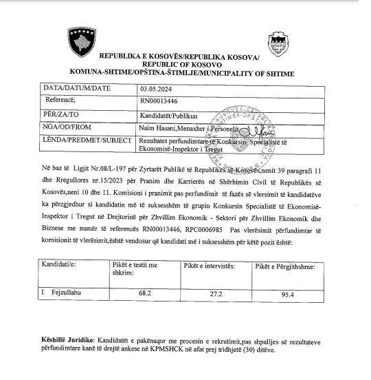 Por në anën tjetër dokumentin të cilin e ka siguruar Rrjeti, thuhet se vendimi është i bazuar në ligjin Nr.08/L-197 për zyrtarët publik të Republikës së Kosovës neni 39 paragrafi 11 dhe rregullores nr. 15/2023 për pranim dhe karrierën në shërbimin civil të Republikës së Kosovës, neni 10 dhe 11. “Komisioni i pranimit pas përfundimit të fazës së vlerësimit të kandidatëve ka përzgjedhur si kandidatin më të suksesshëm të grupit në konkursin specialist të ekonomisë- inspektor i tregut në drejtorinë për zhvillim ekonomik-sektori për zhvillim ekonomik dhe biznese”, sqarohet në vendim.