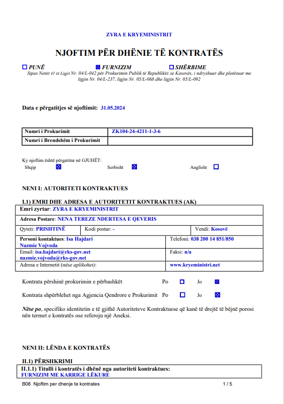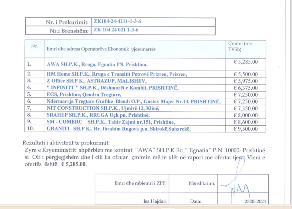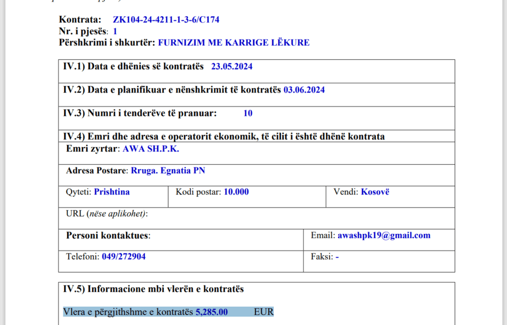 “Furnizim me karrige lëkure. Vlera e përgjithshme e kontratës 5,285.00 euro. Data e planifikuar e nënshkrimit të kontratës 03.06.2024. Numri i tenderëve të pranuar: 10. Emri dhe adresa e operatorit ekonomik, të cilit i është dhënë kontrata AWA SH.P.K.”.