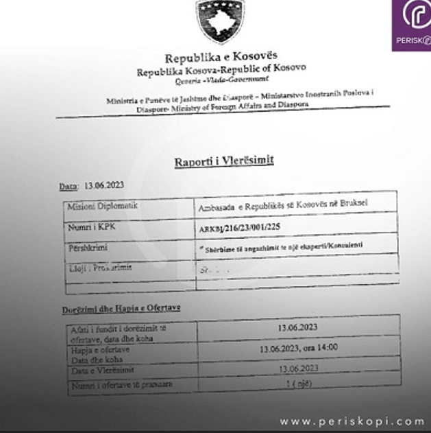 Për ta gjetur konsulentin, Ministria e Jashtme kishte hapur ofertë më 13 qershor 2023 dhe dy ditë më vonë, pra më 15 qershor 2023, Komisioni vendos të mblidhet për ta përfunduar procesin e vlerësimit (të kandidatit, v.j).