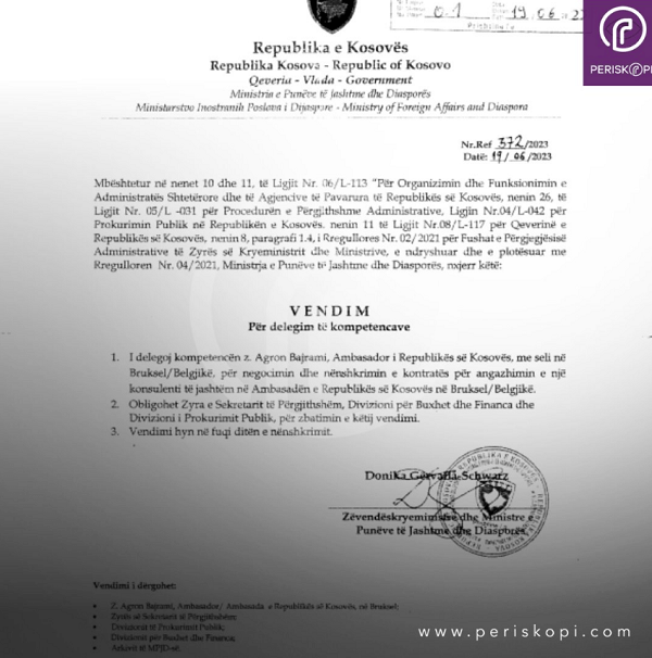 Në qershor të këtij viti, ministria e Donika Gërvallës, nëpërmjet një vendimi që e kishte publikuar Periskopi dhe mund ta shihni më poshtë, ia kishte deleguar kompetencat e negociimit të një kontrate për ‘superkonsulentin’, ambasadorit të Kosovës në Bruksel, Agron Bajramit.