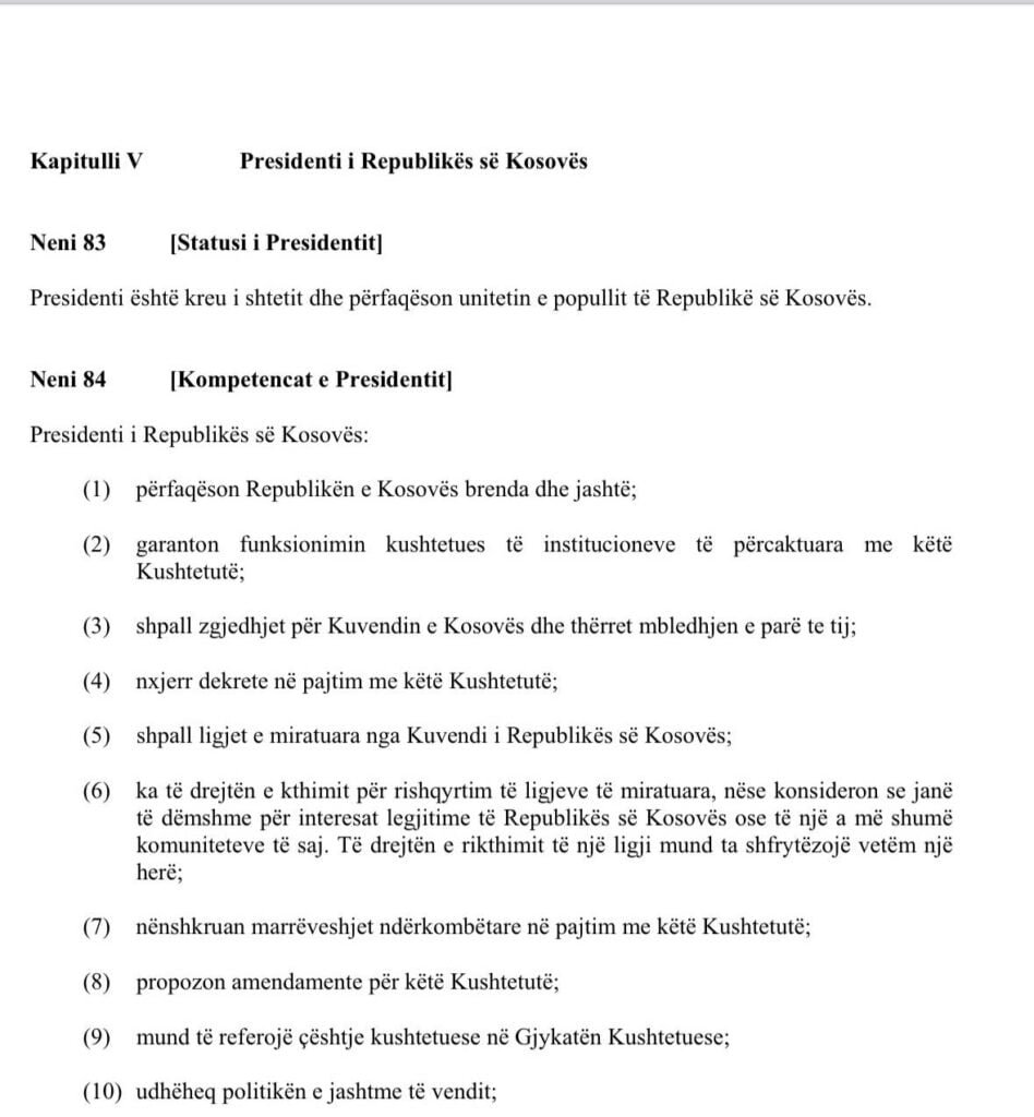 Ndërkaq, sipas pikës së nëntë të nenit 84, presidenti mund të referojë çështje kushtetuese në Gjykatën Kushtetuese.