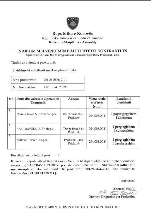 Ndonëse në garë për këtë tender ishin tri kompani: “Prime Tours&Travel”, “AS TRAVEL CLUB” dhe “Altavia Travel”, që të tria të përgjegjshme, prokurimi i kuvendit e ka shpërblyer “AS TRAVEL CLUB” me rreth 300 mijë euro.