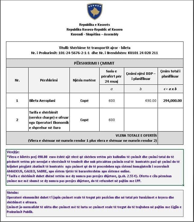 Në përshkrimin e çmimit thuhet se vlera e biletës prej 490.00 euro është një vlerë që shërben vetëm për kalkulim të çmimit dhe çmimi total do të përdorët vetëm për nevojat e vlerësimit të tenderit dhe nuk përcakton çmimin real të kontratës pasi që çmimi do të krijohet përgjatë zbatimit të kontratës nga çmimet që do të procedohen nga sistemi kompjuterik i rezervimit AMADEUS, GALILO, SABRE, apo sistem tjetër të barasvlershëm apo sisteme online./IndeksOnline/