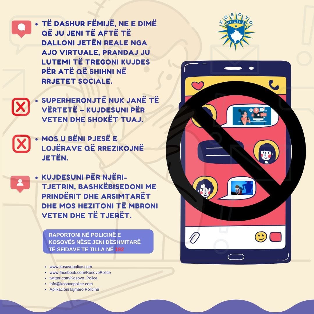 “Të dashur fëmijë dhe prindër, kujdesi në botën virtuale është po aq i rëndësishëm sa ai në jetën reale. Mos u mashtroni nga ajo që shihni në rrjetet sociale dhe mos bëni pjesë në lojëra që rrezikojnë jetën. Bisedoni hapur me prindërit dhe mësuesit tuaj – vetëm së bashku mund të mbrojmë veten dhe të tjerët”.