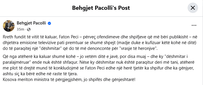 Pacolli në postimin e tij të bërë në Facebook, ka thënë se ministri Peci kishte deklaruar në dhjetëra emisione televizive se do të paraqitej një dëshmitar i cili, do ta denonconte biznesmenin për “vrasje të heronjve”.