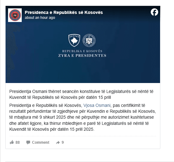 “Presidentja e Republikës së Kosovës, Vjosa Osmani, në përputhje me autorizimet kushtetuese dhe afatet ligjore, ka thirrur mbledhjen e parë të Legjislaturës së nëntë të Kuvendit të Kosovës për datën 15 prill 2025”, ka thënë Presidenca.