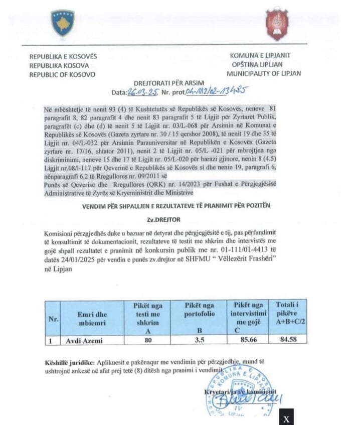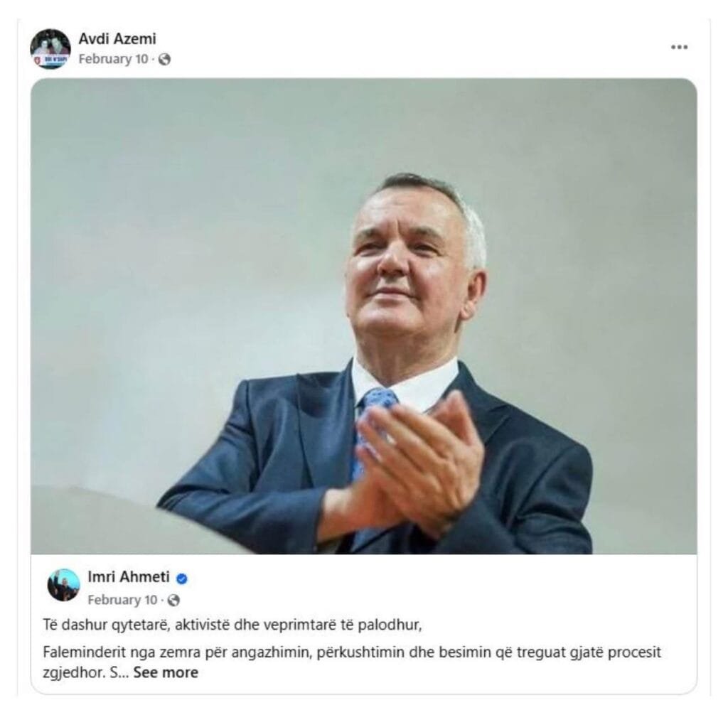 Ai ne facebook ka shkruar se , “Imri Ahmeti, sekretari i LDK-së, pas mashtimit të qytetarëve të Lipjanit për t’ua marrë votat për kandidaturën e Lumirit, ka rikthyer fuqishëm praktikat e vjetra të partisë, atë të punësimit të militantëve të partisë. Shembull i kësaj është edhe ky i konkursit të fundit për zv.drejtor të Shkollës “Vëllezërit Frashëri”. Aty për zv.drejtor më i miri me pikë u zgjedh më militanti i partisë, Avdi Azemi. Kjo lëvizje tregon qartë se, pavarësisht premtimeve dhe angazhimeve për ndryshim, LDK-ja vazhdon të ndjekë të njëjtat taktika të vjetra të punësimit të mbështetësve, duke injoruar meritokracinë dhe interesin e përgjithshëm”, ka shkruar ai.