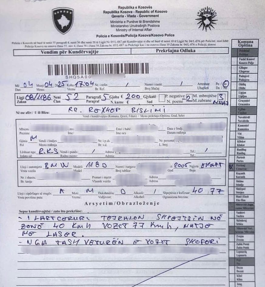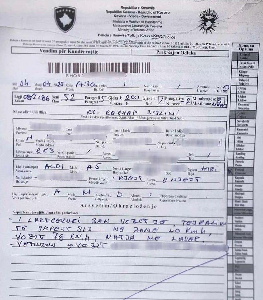 Me datën 04.03.2025, policia e stacionit në Ferizaj, në dy raste të ndara, ka ndaluar shoferët A. N. (36 vjeç) dhe A. B. (28 vjeç), të cilët në rrugën “Rexhep Bislimi” kanë tejkaluar shpejtësinë e lejuar. Në një zonë me kufizim shpejtësie prej 40 km/h, njëri nga shoferët po lëvizte me 77 km/h, ndërsa tjetri me 76 km/h.