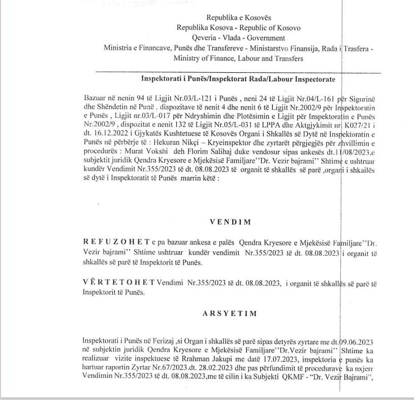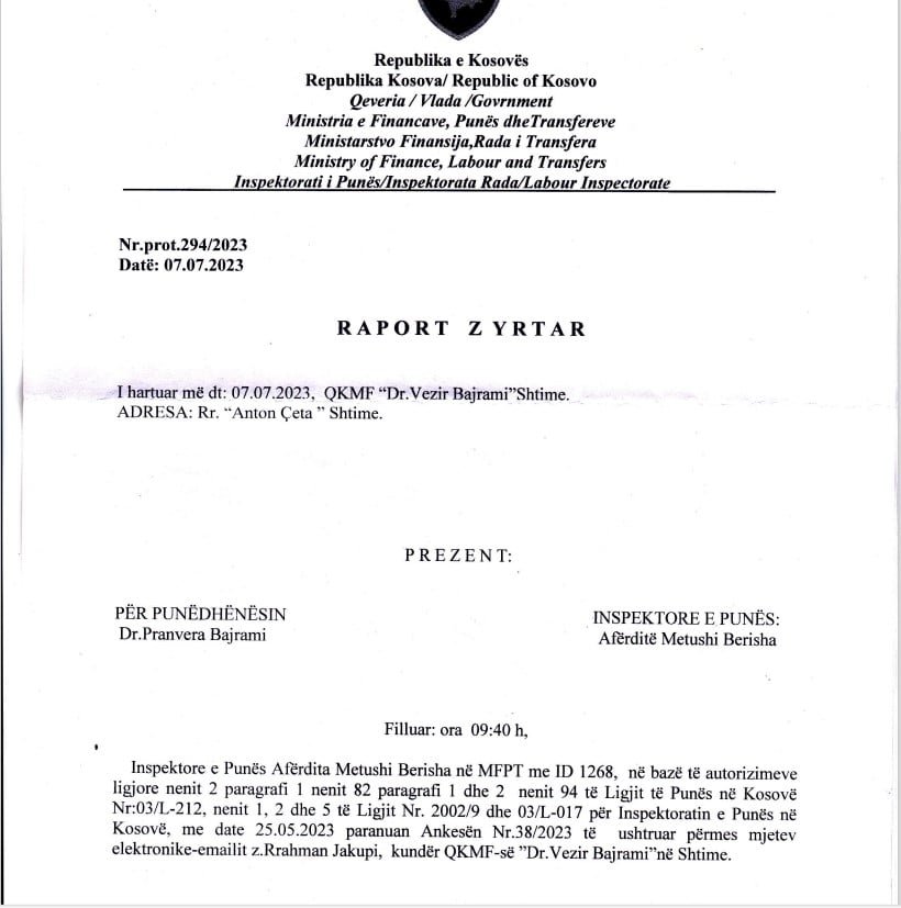 “Punëdhënësi QKMF-Shtime nuk prezantoi dëshminë si janë të punësuar mjekët specialistë Dr. Beqir Beqa dhe Dr. Efendi Sahiti apo janë të angazhuar përmes Kontratës Publike Kornizë 24 mujore Nr.03.01.014 të lidhur me datë 20.04.2021 ndërmjet “Caritas Kosova” dhe Komuna e Shtimes, për shërbime shëndetësore shtëpiake-paliative dhe shërbimet sociale e rezidenciale për personat në nevojë në Komunën e Shtimes – Kontratë kornizë me numër 617-21-905-2-1-1, e cila kontratë nuk përmban pozitat të cilat i ushtrojnë mjekët e lartcekur dhe në këtë rast punëdhënësi ka bërë shkelje të nenit 10, nenin 11 të Ligjit të Punës Nr.03/L-212, sipas të cilit kontrata e punës lidhet në formë të shkruar dhe nënshkruhet nga punëdhënësi dhe i punësuari dhe kontrata duhet të përfshin elementet e përcaktuara sipas nenit 1 1 të këtij ligji, ku vërtetohet se pretendimet e palës ankuese janë të bazuara”, thuhet tutje në raport, përcjell Demokracia.com.